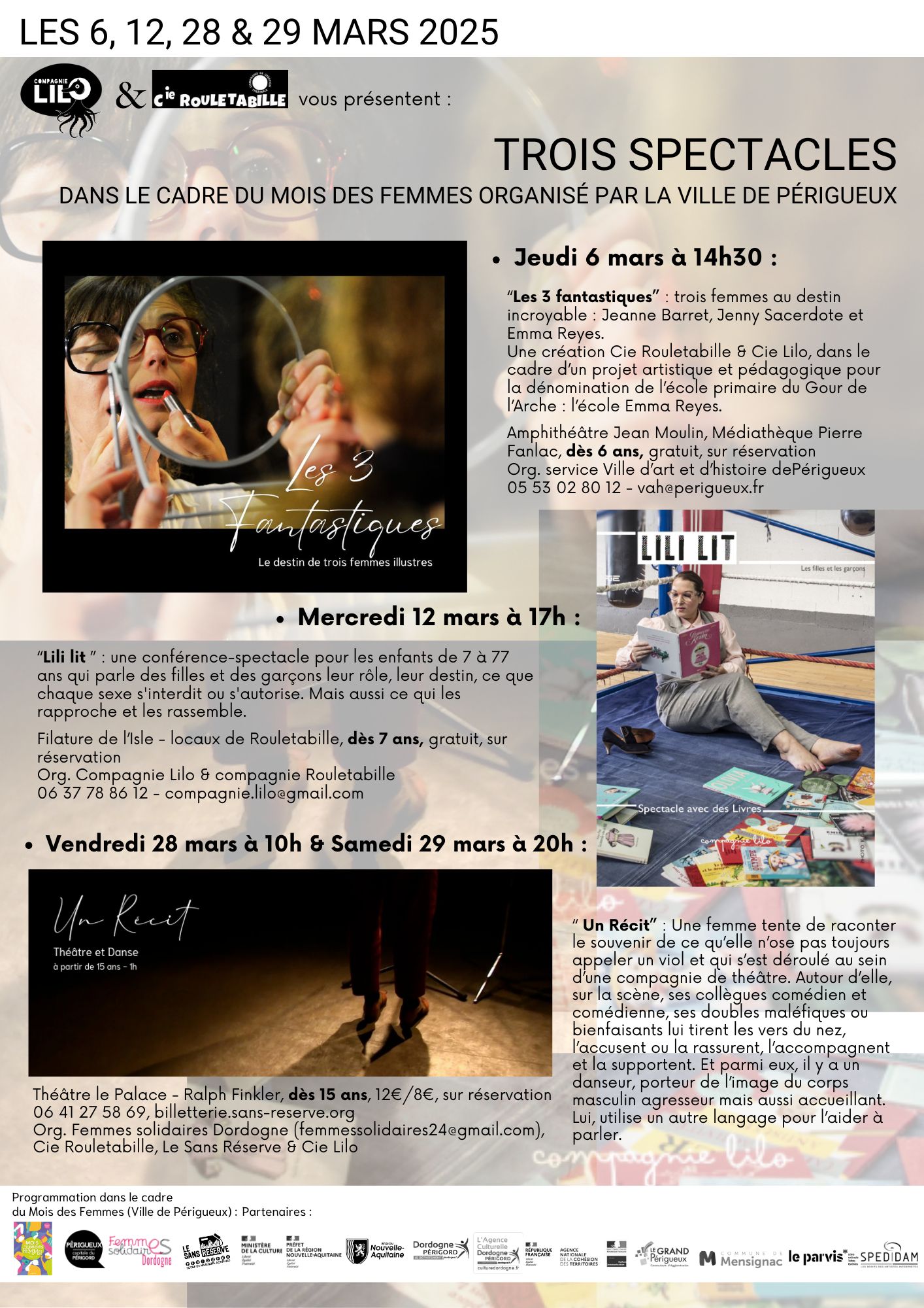 Et elle est soutenue par : La Ville de Périgueux (24) Le Centre Culturel Le Forum (Ribérac 24) Le Sans Réserve, Scène de Musiques Actuelles (24) Le Réseau Scènes Nomades (79) La commune de Fors (79) L’Association Les Bastonnades (24) Le Centre Culturel La Fabrique (24) Le Lieu Chantier Théâtre Cie Florence Lavaud (24) La commune Val Louyre & Caudeau (24) association Femmes Solidaires Dordogne (24) association Enjeu Femmes (24)