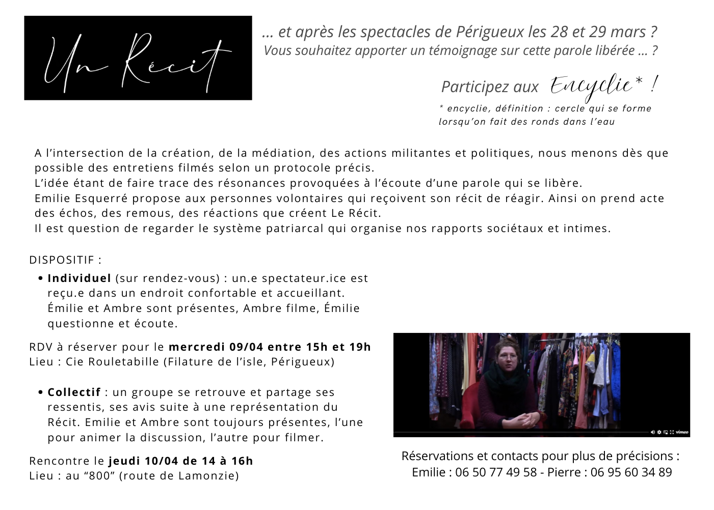 "Un Récit" : Trois personnes se lèvent au milieu des spectateurs, il y a le danseur, Celle-qui-sait et Celle-qui-se-prend-pour-je. Le théâtre est visible. Les pieds des projecteurs et la régie ne sont pas cachés. Là, sur scène, un micro, espace de la prise de parole publique. Celle-qui-se-prend-pour-je essaie d’y raconter son viol, dans l’élan proposé par Adèle Haenel. Elle est confrontée à elle-même, Celle-qui-sait l’incite par tous les moyens en son pouvoir, à raconter son souvenir traumatique. Mais le souvenir se défile, et Celle-qui-se-prend-pour-Je en profite pour aller danser.